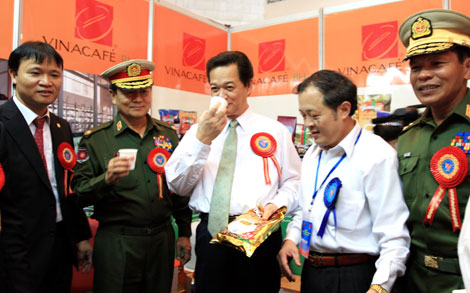 đang dùng thử sản phẩm Vinacafe trong triển lãm tại Myanmar