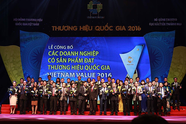 Phó Thủ tướng Thường trực Chính phủ Trương Hòa Bình và Bộ trưởng Bộ Công thương Trần Tuấn Anh trao tặng biểu trưng cho 88 doanh nghiệp đạt Thương hiệu Quốc gia 2016.