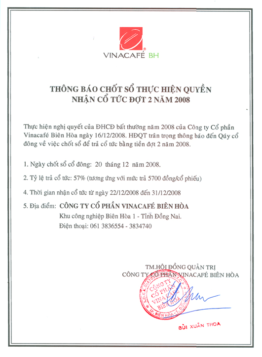 Thông báo thực hiện quyền nhận cổ tức đợt 2 năm 2008
